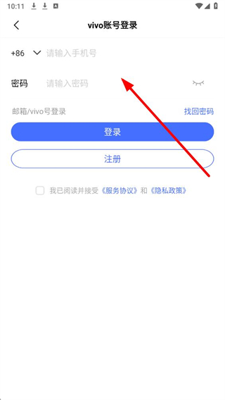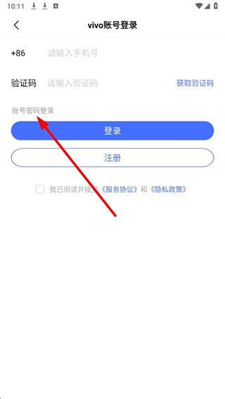 2、进入vivo账号登录界面后,点击账号密码登录选项,可切换至密码登录的输入模式。