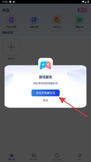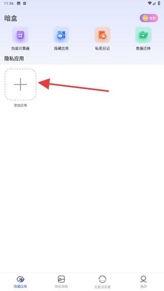 1、打开暗盒应用软件,在首页内,隐私应用下点击添加应用的功能按钮。
