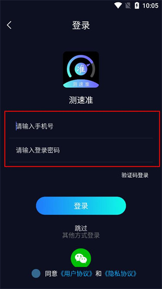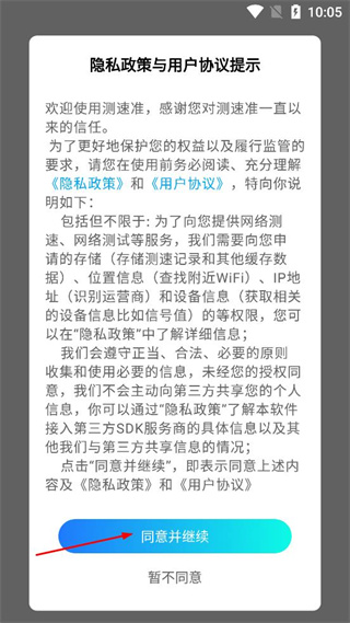 1、打开测速准软件,查看弹出的隐私政策与用户协议提示,点击同意并继续按钮。