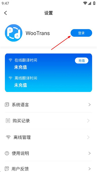 2、在设置页面中,找到WooTrans右侧的登录按钮,点击该按钮进入登录界面。