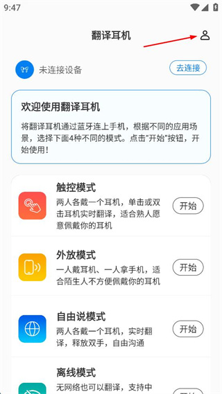 1、打开翻译耳机软件,点击界面右上角的人物图标,进入对应的设置页面。