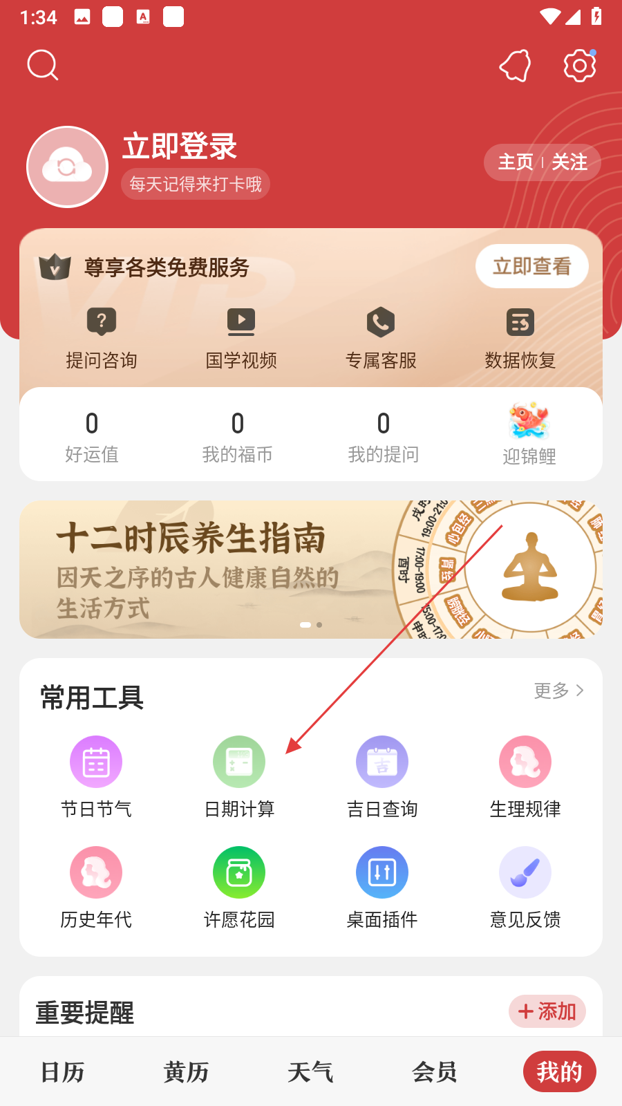 1、打开中华万年历APP,点击底部导航栏我的选项,进入个人中心界面,在常用工具板块找到日期计算选项并点击。