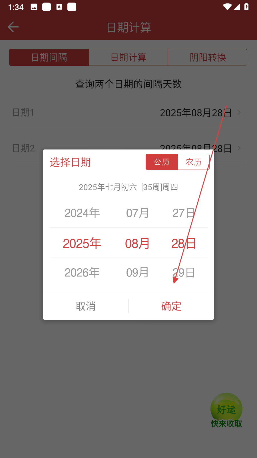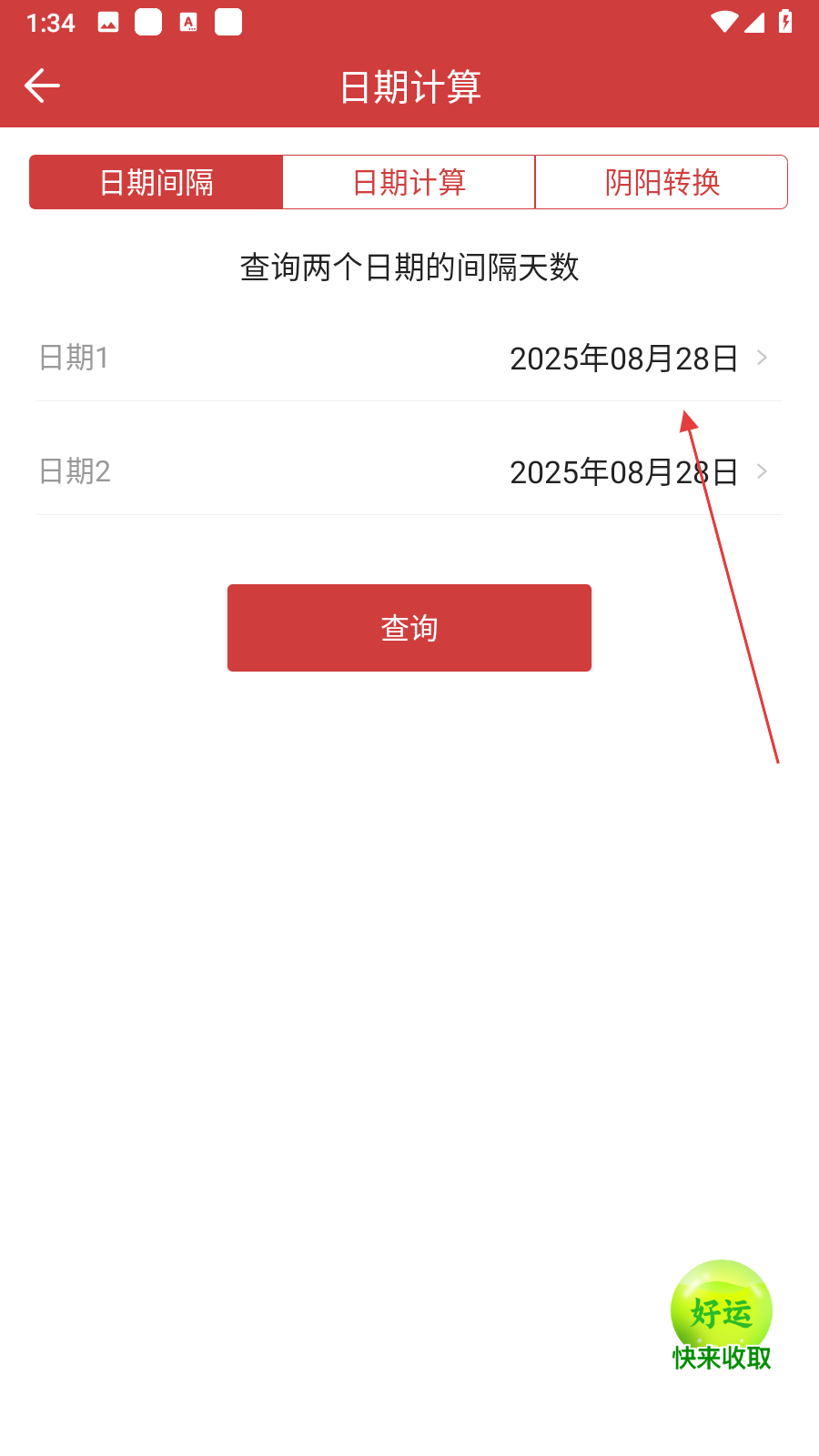3、点击日期2,同样从弹出的日期选择框选择结束日期并点击确定,完成后点击查询按钮,即可得出两个日期之间的间隔天数。