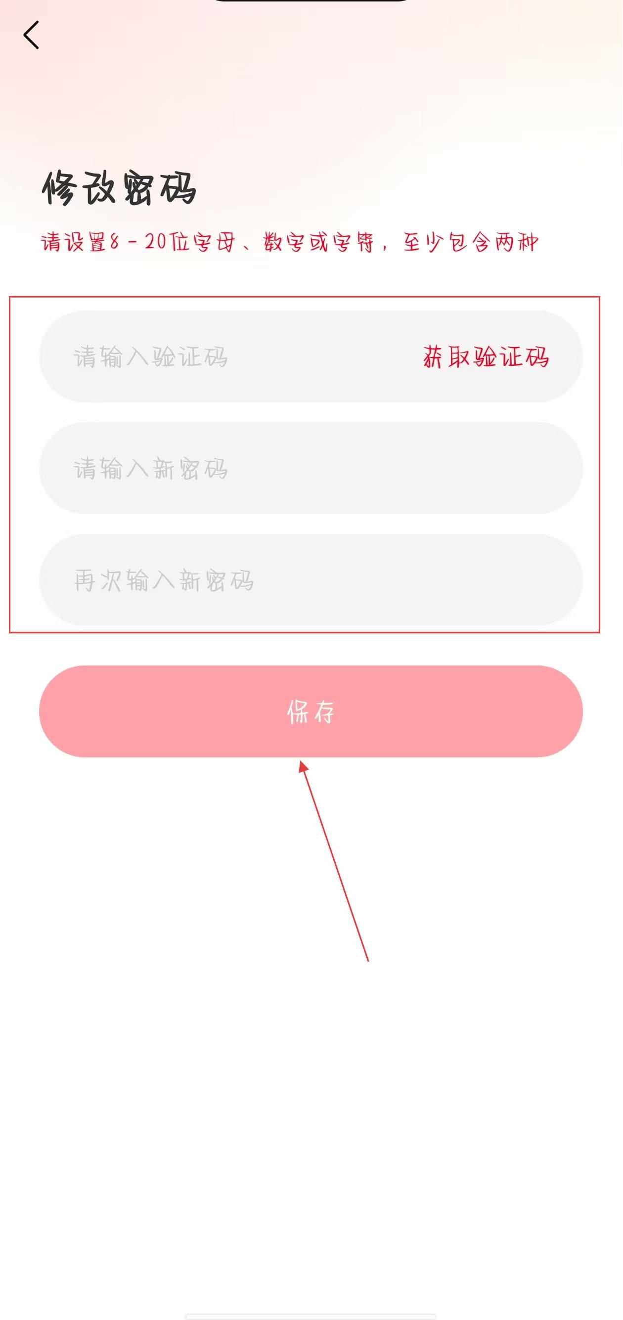 4、在修改密码页面,输入验证码,设置8-20位且至少包含字母、数字或字符中两种的新密码,再次输入新密码确认,最后点击保存。