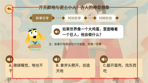 3、在故事页面,参与故事引导环节的题目选择,推进故事阅读流程。