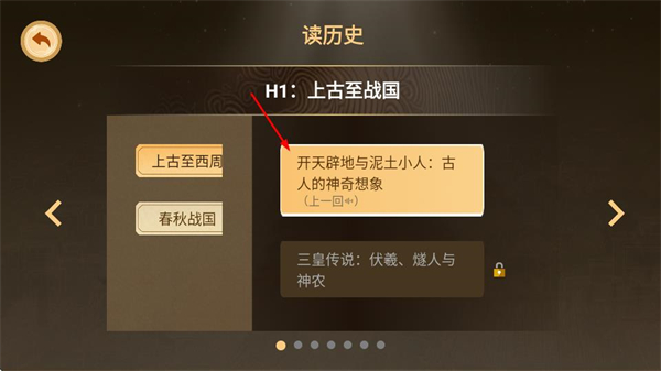 2、在读历史页面,点击开天辟地与泥土小人内容,进入对应故事页面。