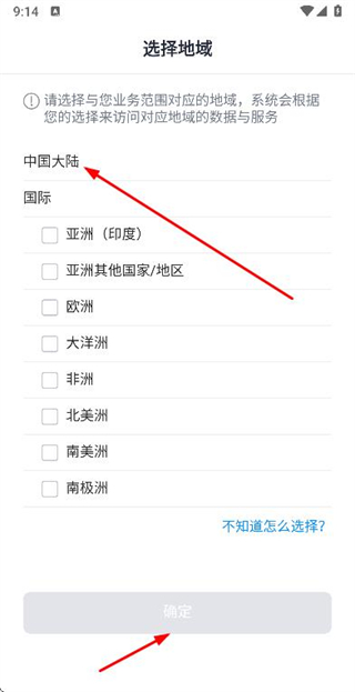 2、在选择地域页面选择中国大陆选项后,点击确定按钮,进入登录页面。
