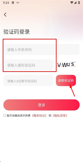 2、在手机登录页面填写手机号图片验证码,勾选协议后,点击获取验证码。