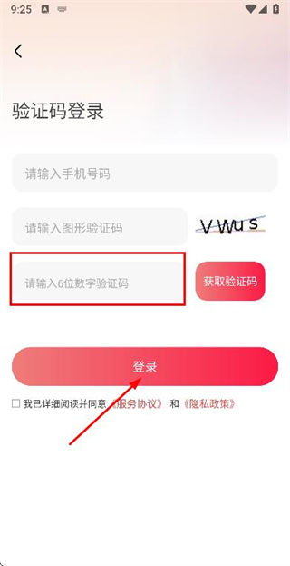 3、在验证码输入框中填写收到的验证码,点击登录完成账号的登录操作。