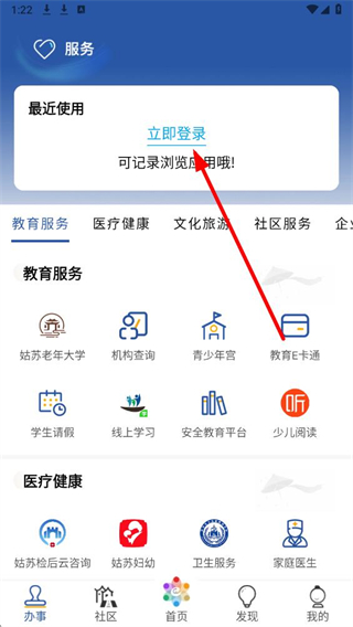 1、在惠姑苏界面中,找到立即登录按钮并点击,进入账号登录的选择界面。