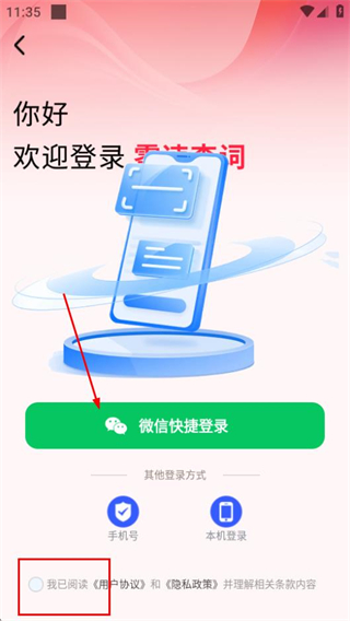 3、在登录选择页面,勾选协议后点击微信快捷登录按钮,完成账号登录操作。