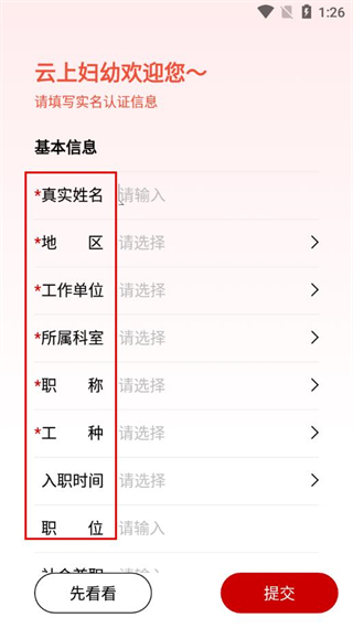 3、在实名认证页面填写基本信息,真实姓名、地区、工作单位、所属科室等为必填项。