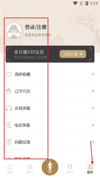 4、在我的页面可登录/注册账号,管理收藏的穴位、查看已学内容,还能联系客服反馈问题。