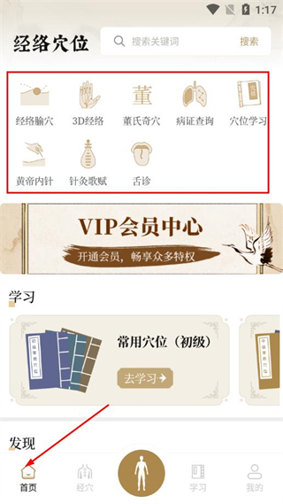 1、在首页点击经络腧穴等入口,了解app的所有内容。