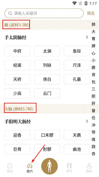 2、查看不同经络对应的穴位,同时能了解经络对应的时辰。