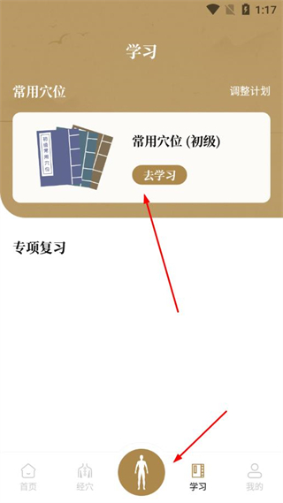 3、在学习页面可参与常用穴位等课程,系统学习穴位知识,还有专项复习功能巩固内容。