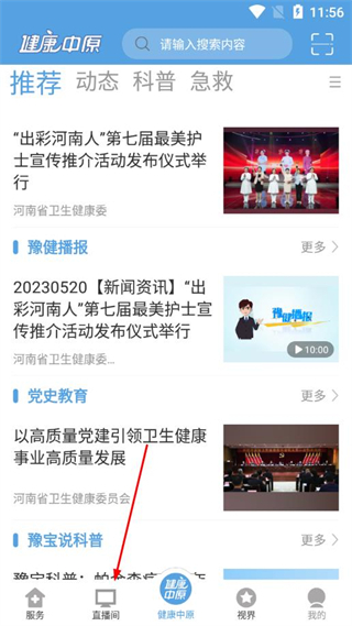 1、打开健康中原app首页,点击底部直播间,进入直播相关页面。