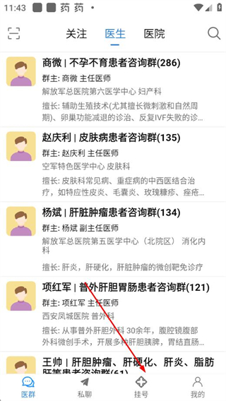 1、打开就医号app,点击底部挂号选项,进入医生列表页面。