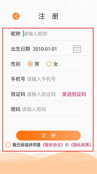 3、填写昵称、出生日期、性别、手机号,获取并输入验证码,设置密码后勾选同意协议,点击注册。