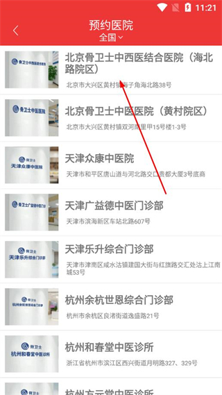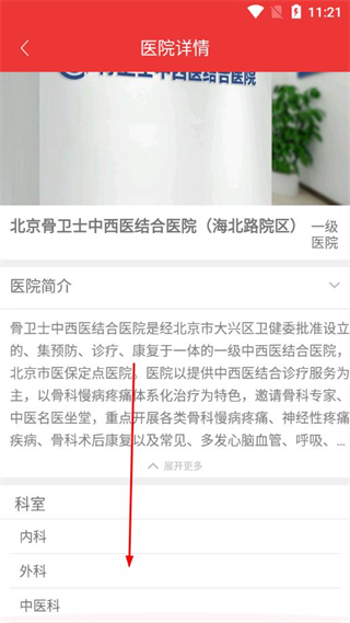 2、在医院列表中选择目标医院,进入医院详情页面。