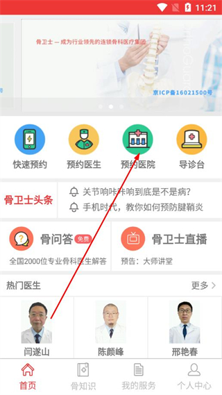 1、打开骨卫士app首页,点击预约医院选项,进入预约医院列表页面。