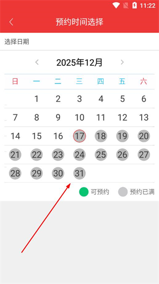 6、在预约时间选择页面,选择可预约的日期,完成挂号预约操作。