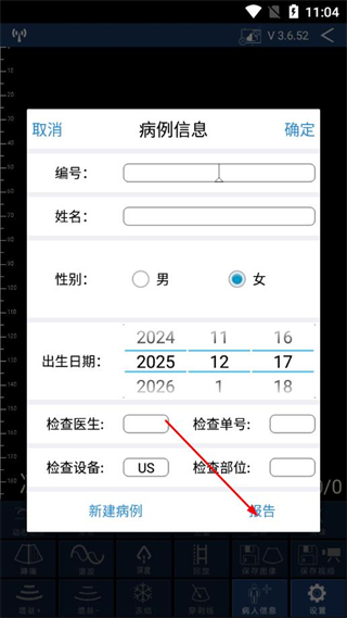 2、在病例信息页面填写编号、姓名、性别等患者信息,填写完成后,点击报告。