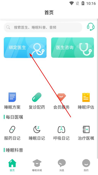 1、打开智慧云睡眠app首页,点击绑定医生选项,进入医生信息页面。