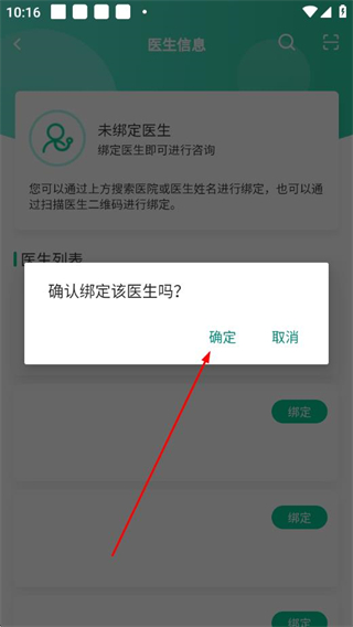 3、在弹出的确认绑定该医生吗提示框中,点击确定,完成医生绑定操作。