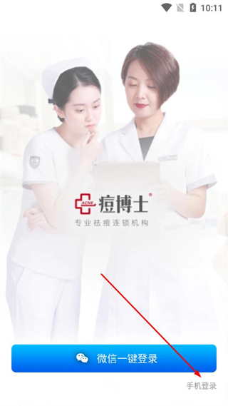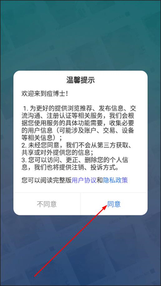 1、打开痘博士app,在弹出的温馨提示页面点击同意,进入登录选择页面。