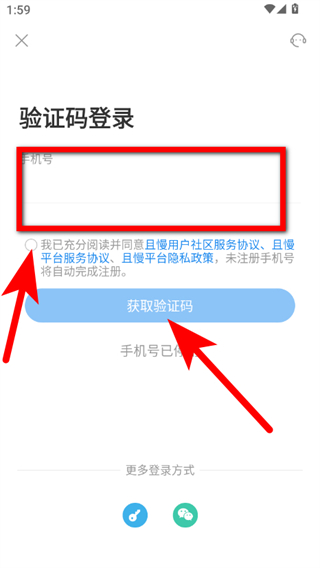 3、在登录页面,输入手机号,勾选同意协议后点击获取验证码。