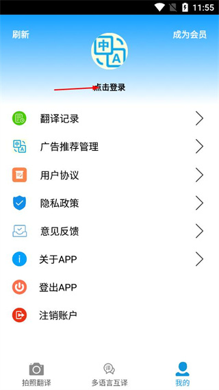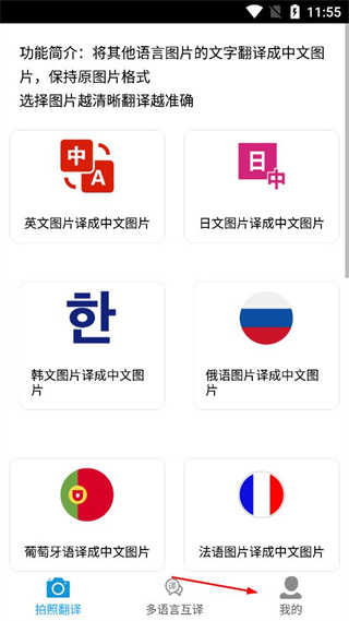 1、打开多语言图片翻译应用,进入主页面后,点击页面右下角的我的选项,进入个人页面。