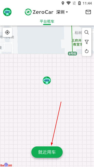 4、完成登录后回到平台租车页面,点击页面下方的就近用车按钮,即可进行用车操作。