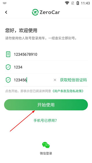 3、点击获取短信验证码按钮,填写收到的短信验证码,确认信息无误后点击开始使用按钮。