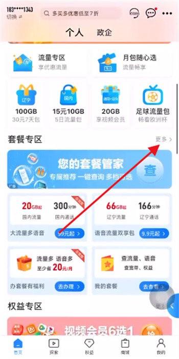 1、首先,打开软件进入,并从首页向下滑动,找到【套餐专区】;