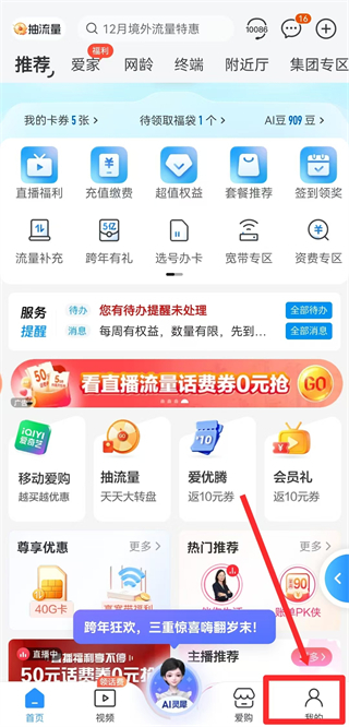 1、打开中国移动APP,点击右下角我的,进入个人页面。