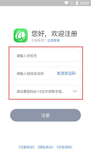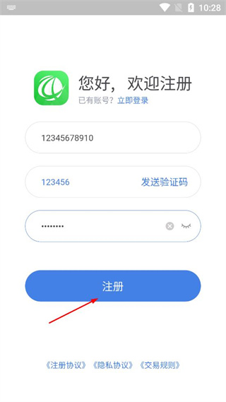 3、在注册界面中,依次填写手机号、短信验证码,设置符合要求的登录密码。