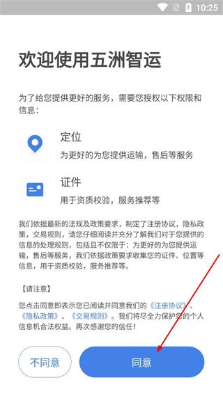 1、打开五洲智运软件,查看弹出的权限授权提示,点击界面中的同意按钮。
