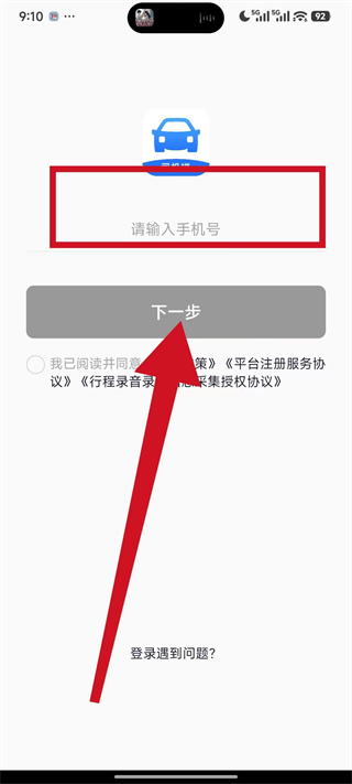 2、在手机号输入页面,填写司机的手机号码,勾选相关协议后点击下一步,进入验证环节。