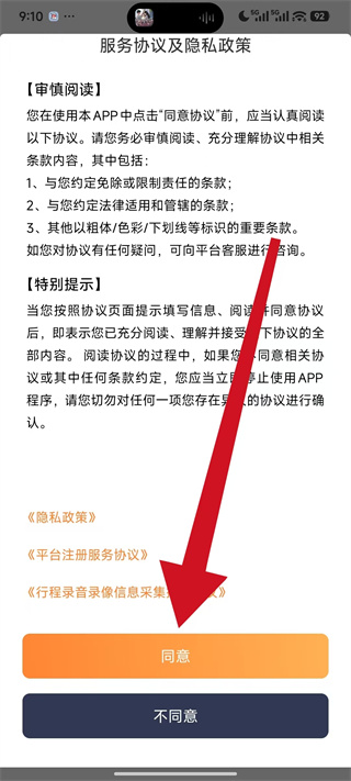 1、打开美团出租司机,在服务协议及隐私政策页面点击同意,进入账号注册的信息填写页面。