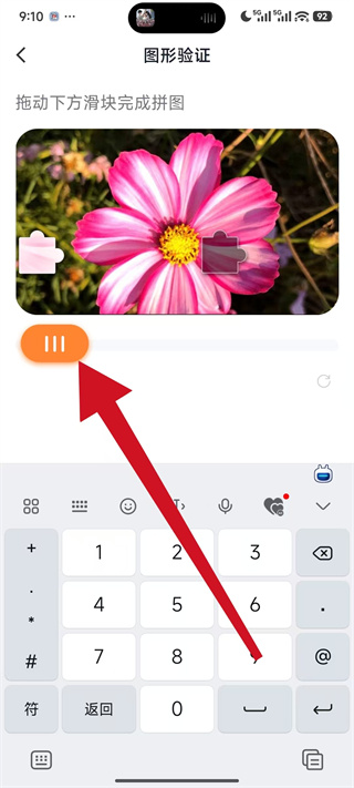 3、在图形验证页面,拖动下方滑块完成拼图验证,通过后触发验证码的获取流程。
