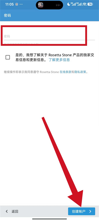 4、在密码页面,设置账户密码,勾选相关协议选项后,点击创建帐户,完成账户创建。
