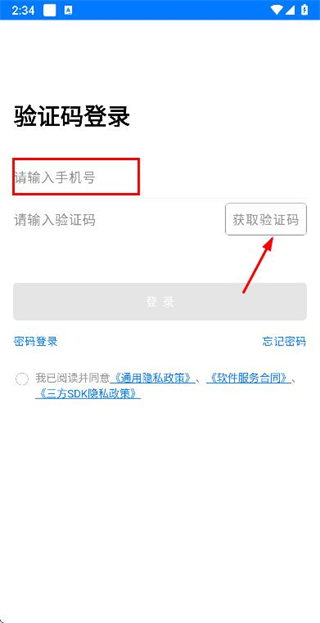 2、在手机登录页面填写手机号,勾选协议后,点击获取验证码。