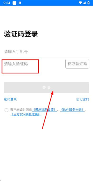 3、在验证码输入框中填写收到的验证码,点击登录完成账号的登录操作。