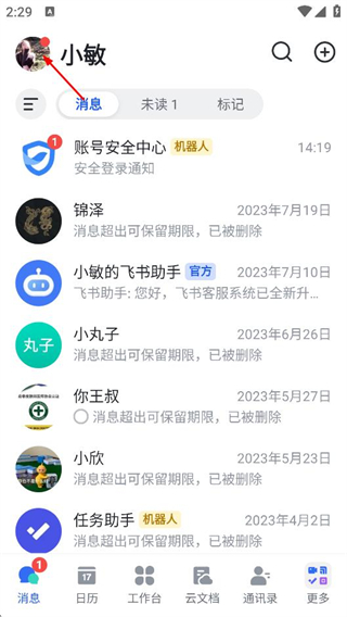 1、在飞书的消息页面,点击左上角的个人头像,展开个人信息侧边栏。