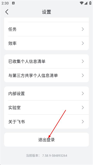 3、在飞书的设置页面中,点击底部的退出登录选项,完成飞书账号的退出操作。