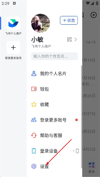 2、在个人信息侧边栏中,找到并点击设置选项,进入飞书的设置页面。