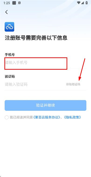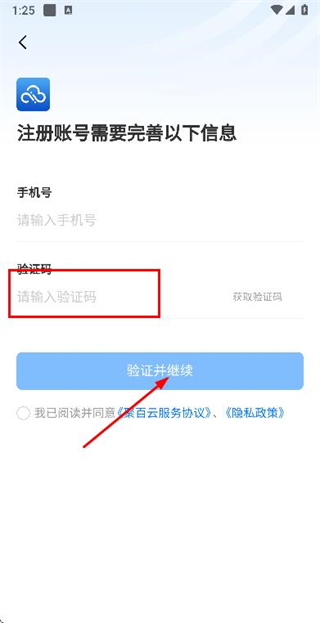 3、在注册账号页面填写验证码,勾选协议后点击验证并继续完成注册操作。