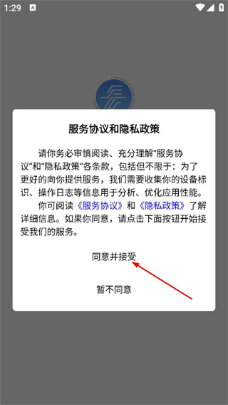 1、在服务协议和隐私政策弹窗中,点击同意,进入登录页面。
