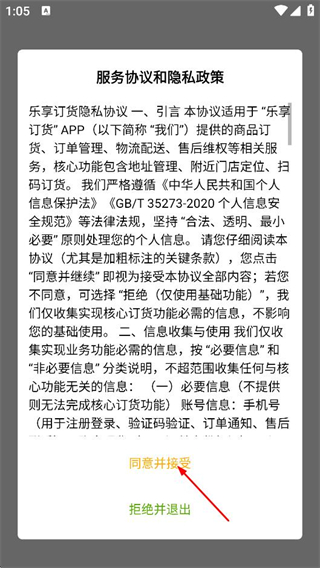 1、在乐享订货的服务协议和隐私政策弹窗中,点击同意,进入登录页面。